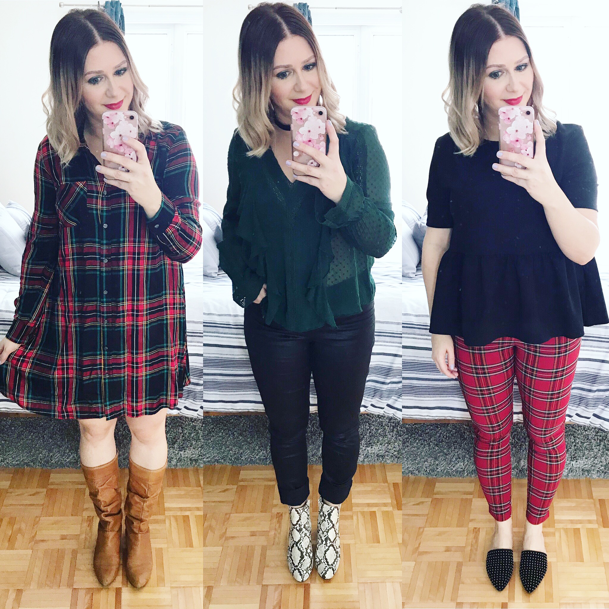 This is probably my favourite look of all three. Those leggings are amazing! They are super stretchy and I feel super festive in them! I opted to style them with studded mules but you can definitely pair them with heeled booties or shoes. The peplum top adds fun to the outfit but a blazer or blouse would also be super nice to wear for a work party.