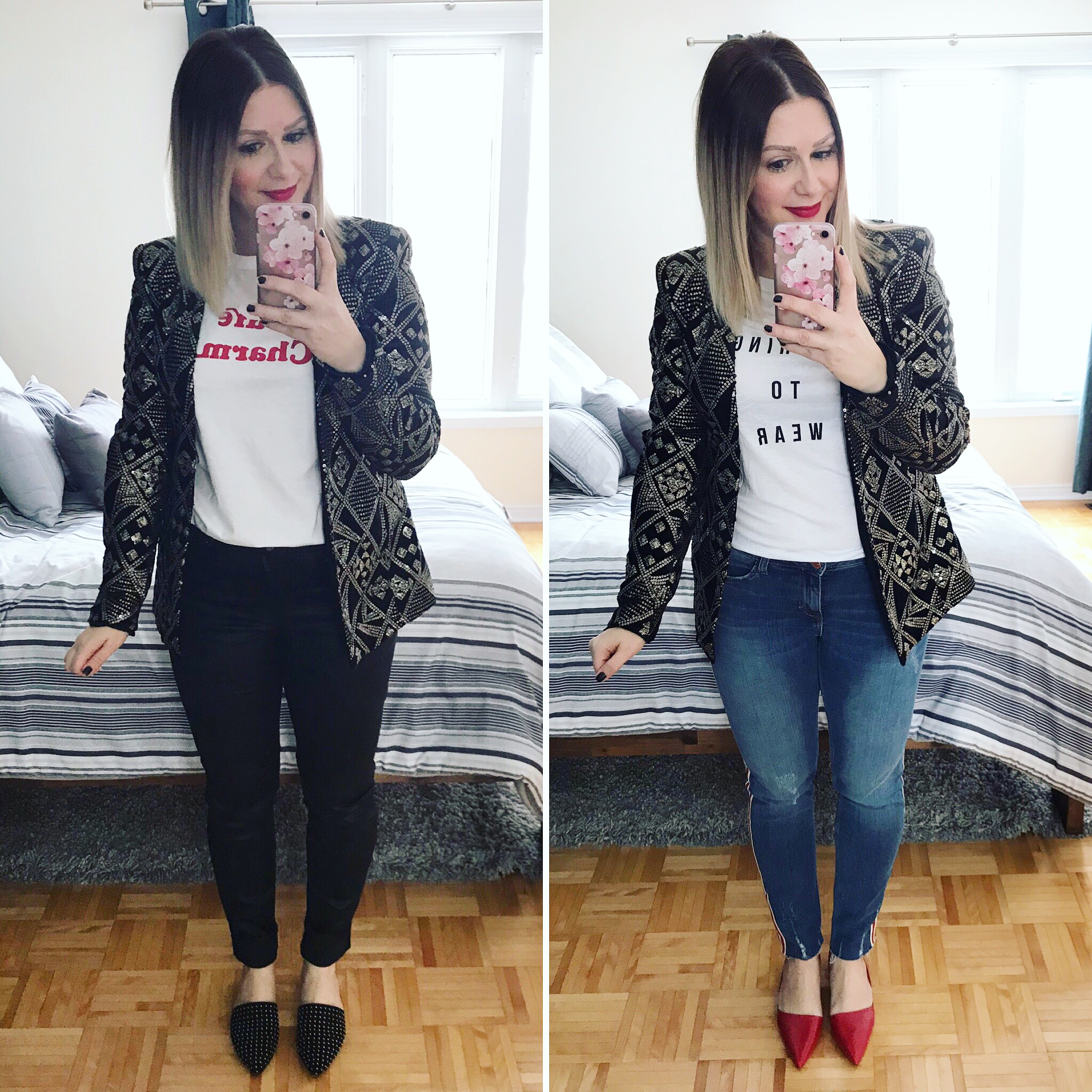 In the first photo, I am pairing my sparkly blazer with black denim, a slogan t-shirt & some studded mules to make it more casual and definitely wearable! I would totally wear this look for work (if your workplace is more open & creative) or for a casual dinner on a Friday night (you could always switch up the mules for heels too!)
