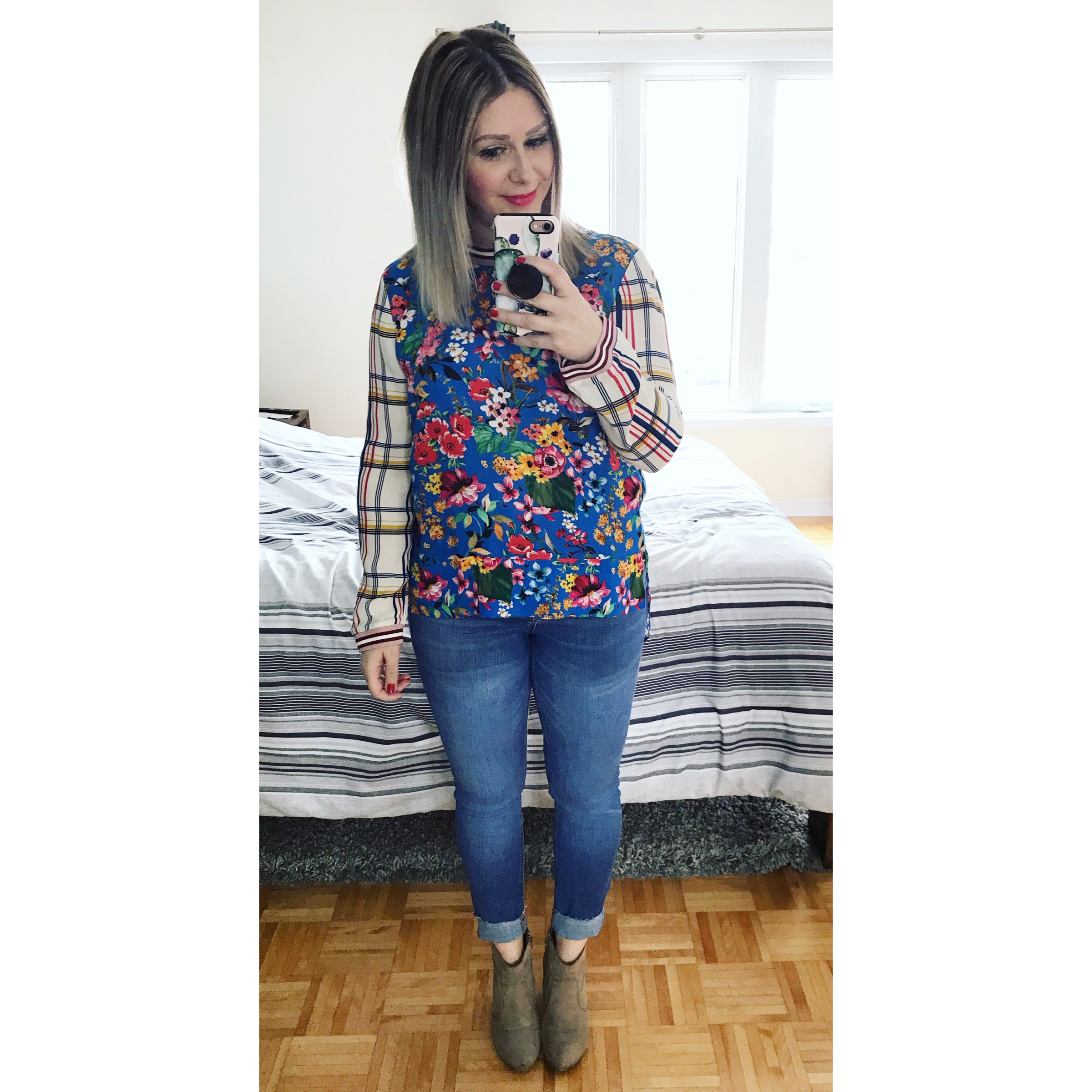 I have always loved mixing prints and this top is seriously amazing! The colours are vibrant and really makes me feel like Spring is finally here! Perfect outfit for a casual Friday, I have paired it with structured denim and heeled neutral booties to finish off the look.