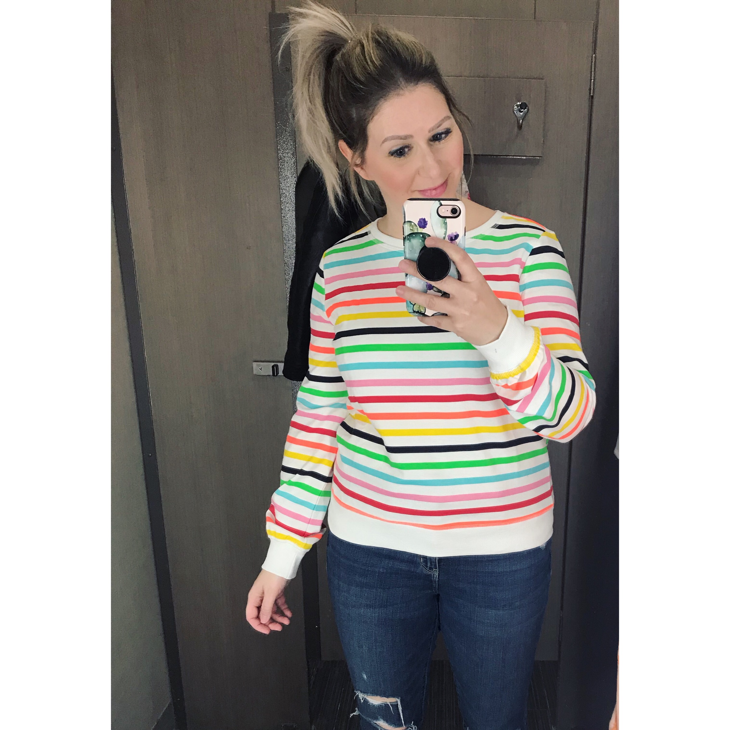 Rainbow sweaters are all the rage right now for Spring and they certainly can brighten an outfit instantly! I love how they add a bright & cheery vibe to any look. They are best paired with denim, cut-off denim shorts & even denim skirts.