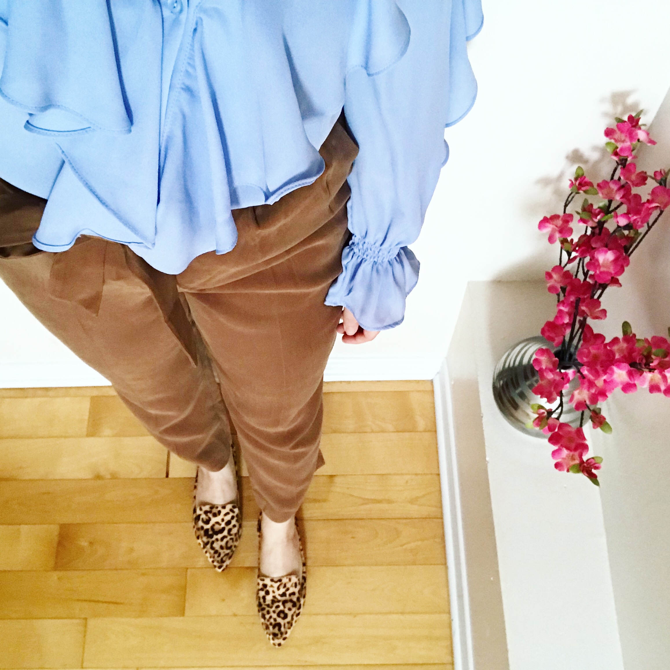 To kick off the first week of June in style (and also because it is raining & cold), I chose to keep things pretty neutral today by mixing my favourite blouse of the moment with some awesome paper bag trousers! And of course, I added some great leopard print shoes because it’s always a good idea 🙂