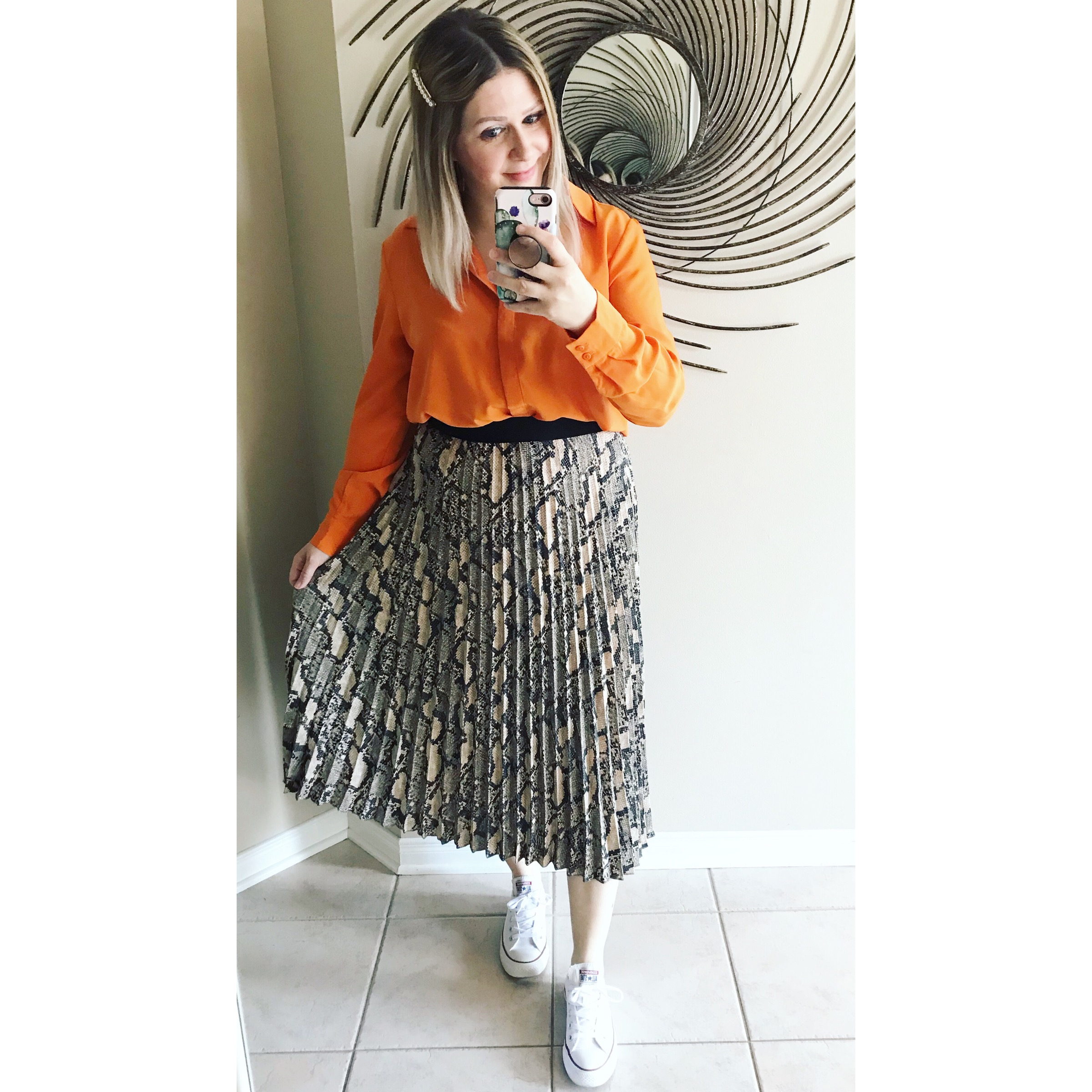 For Today’s Look, I wore my favourite type of skirt: the pleated skirt. I loooove this one as I find it’s a good neutral in my wardrobe even though it’s a print. I have paired mine with a simple colourful button up shirt (great for work!) and my favourite sneakers to make it more casual.