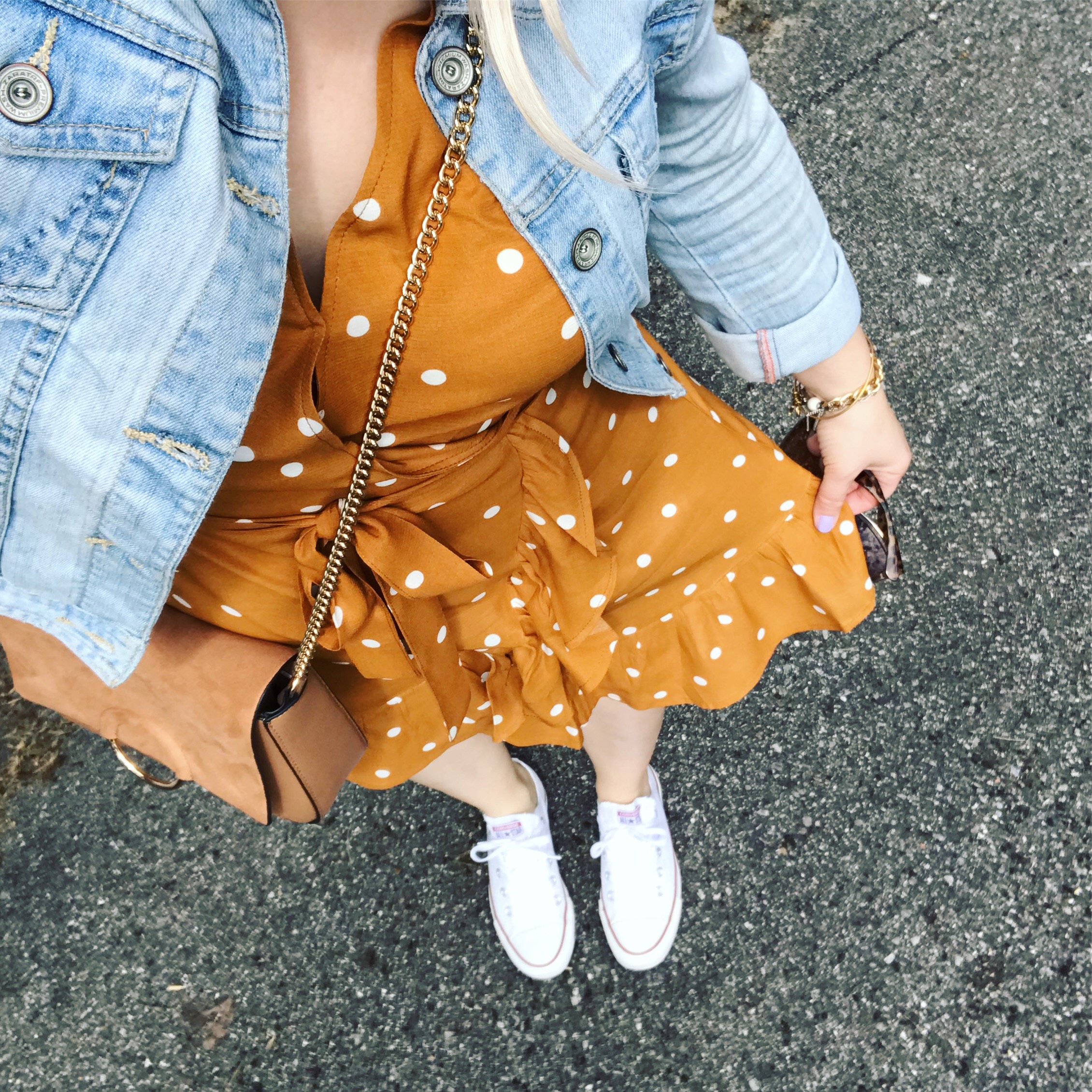 This polka dot wrap dress is so versatile, I think it’s such a great piece for Summer! I am wearing mine with sneakers and a denim jacket to dress it down for a day time look.