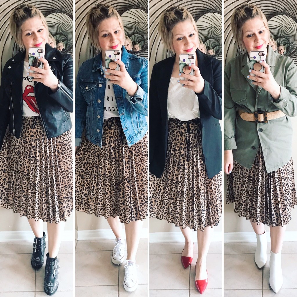 For the first look, I’ve paired my leopard printed skirt with a band tee, a leather jacket and studded booties for a grungy & edgy look. I love mixing prints & patterns together and adding studs in the mix makes my look more rocker chic!