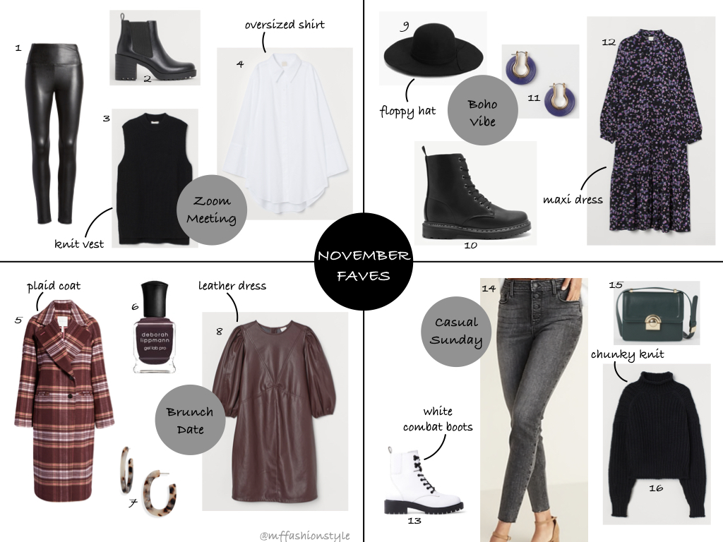 1. FAUX LEATHER LEGGINGS | 2. ANKLE BOOTS | 3. SLEEVELESS TURTLENECK SWEATER | 4. OVERSIZED SHIRT | 5. PLAID COAT | 6. NAIL POLISH | 7. HOOP EARRINGS | 8. FAUX LEATHER DRESS | 9. FLOPPY HAT | 10. COMBAT BOOTS | 11. EARRINGS (SOLD-OUT) LOVE THIS STYLE | 12. COLLARED DRESS | 13. WHITE COMBAT BOOTS | 14. GREY JEANS | 15. SHOULDER BAG | 16. RIBBED TURTLENECK SWEATER
