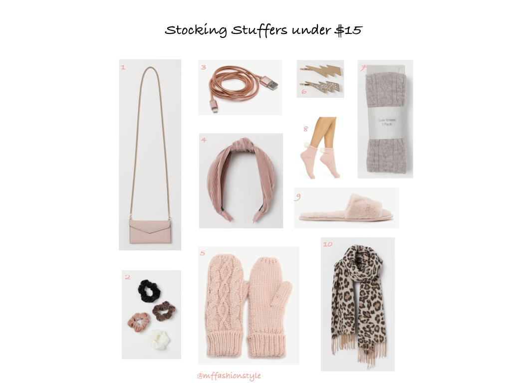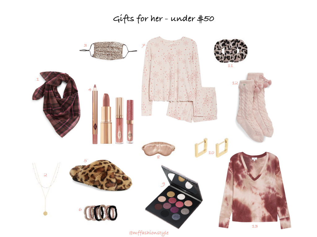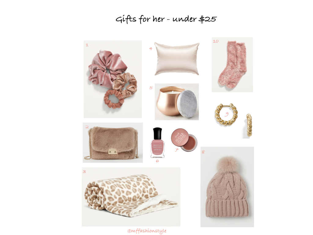 1. HAIR SCRUNCHIE | 2. FAUX FUR SHOULDER BAG | 3. FLEECE BLANKET | 4. SATIN PILLOWCASE (ANOTHER GREAT OPTION) | 5. CANDLE | 6. NAIL POLISH | 7. LIP BALM | 8. KNIT HAT | 9. HOOP EARRINGS (SIMILAR STYLE) | 10. COZY SOCKS