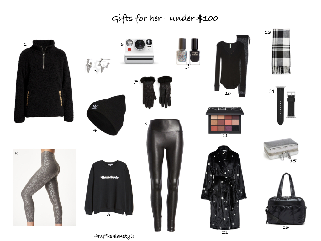 1. FLEECE PULLOVER | 2. LEGGINGS | 3. SPIKED HOOP EARRINGS | 4. LOGO RIBBED BEANIE | 5. HOMEBODY SWEATSHIRT |6. POLAROID | 7. GLOVES | 8. FAUX LEATHER LEGGINGS | 9. NAIL POLISH | 10. PAJAMAS | 11. NARS EYESHADOW PALETTE | 12. PLUSH ROBE | 13. PLAID SCARF | 14. TORY BURCH WATCH STRAP | 15. TRAVEL JEWELRY BOX | 16. DUFFLE BAG