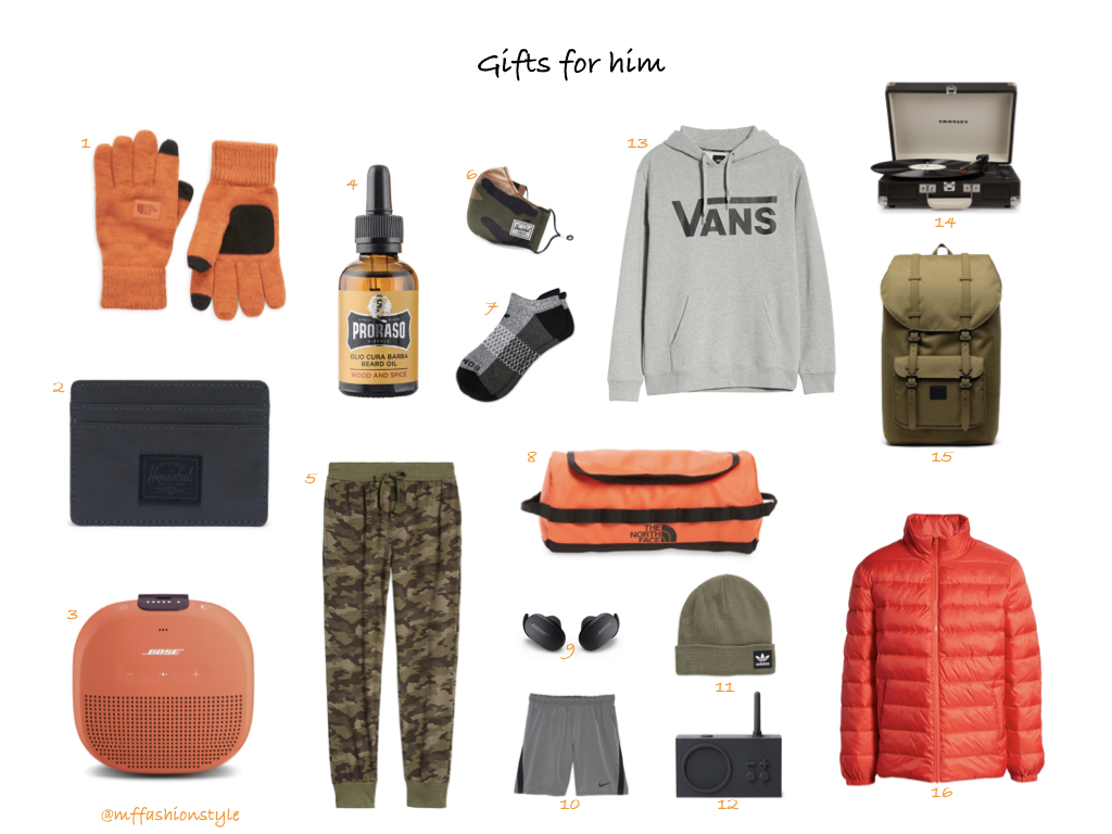 1. TECH GLOVES | 2. CARD CASE | 3. BOSE SPEAKER | 4. BEARD OIL | 5. LOUNGE JOGGERS | 6. FACE MASK | 7. ANKLE SOCKS | 8. TRAVEL CANISTER | 9. BOSE EARBUDS | 10. TRAINING SHORTS | 11. BEANIE | 12. RADIO & BLUETOOH SPEAKER | 13. VANS HOODIE | 14. TURNTABLE | 15. BACKPACK | 16. PUFFER JACKET