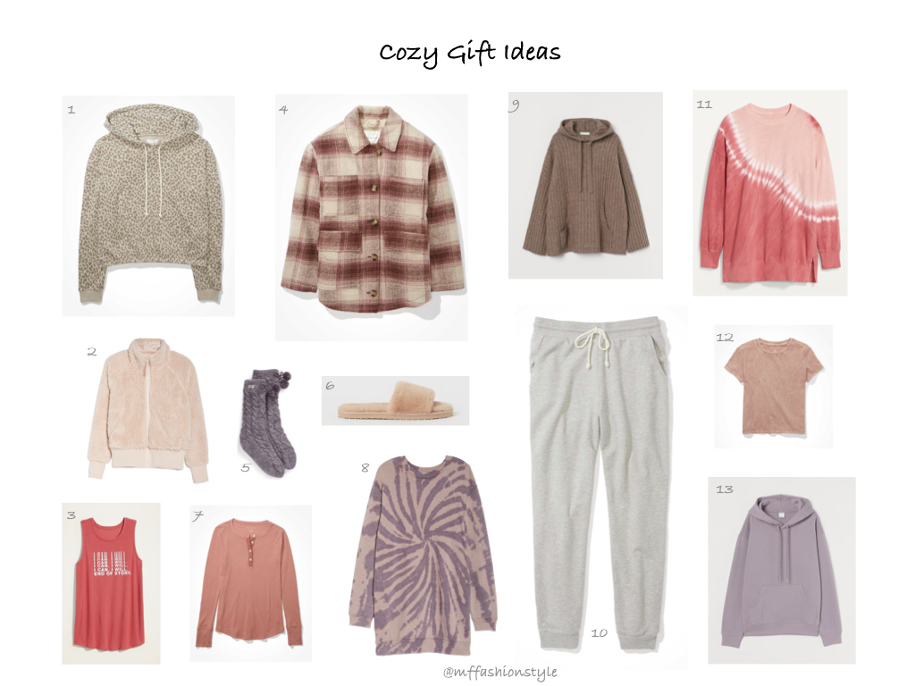 1. FLEECE CINCHED HOODIE | 2. COZY FURRY FLEECE JACKET | 3. TANK TOP | 4. OVERSIZED PLAID BUTTON UP JACKET (SIMILAR ITEM) | 5. POMPOM FLEECE LINED SOCKS | 6. FAUX FUR SLIPPERS | 7. LONG SLEEVE HENLEY T-SHIRT | 8. TIE DYE SWEATSHIRT DRESS | 9. RIB-KNIT WOOL-BLEND HOODIE | 10. FLEECE SLIM BOYFRIEND JOGGER | 11. OVERSIZED TUNIC SWEATSHIRT | 12. CREW NECK T-SHIRT | 13. HOODIE