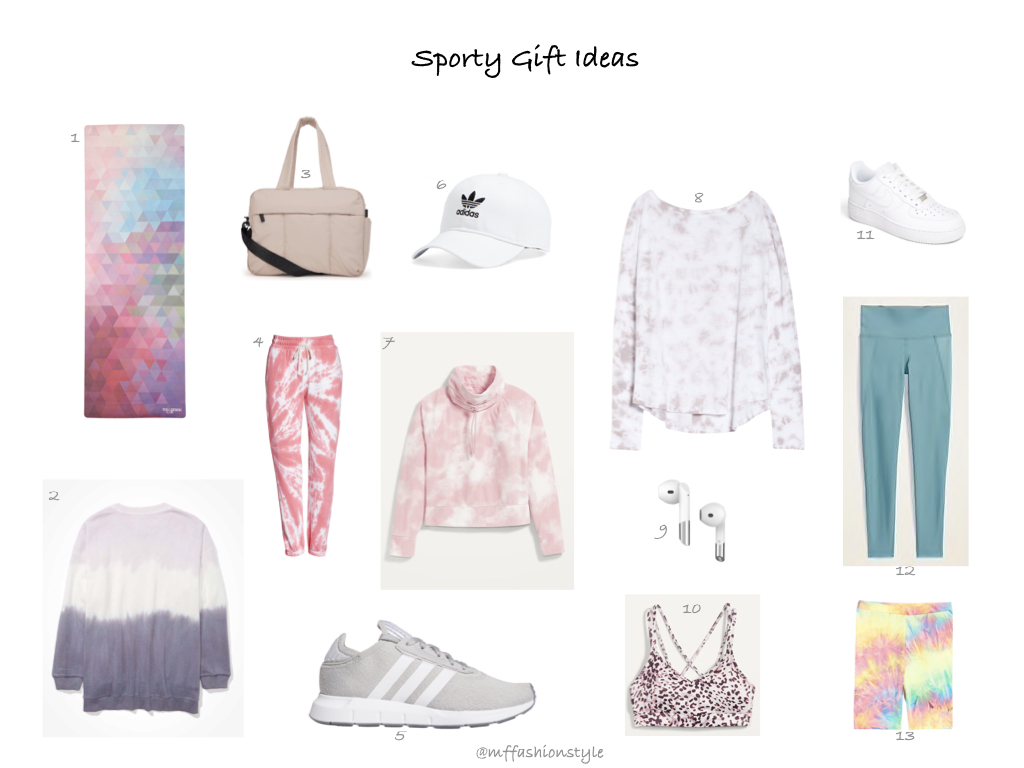 1. YOGA MAT | 2. CREW NECK SWEATSHIRT | 3. DUFFLE BAG | 4. TIE DYE JOGGERS | 5. ADIDAS SNEAKERS | 6. ADIDAS BASEBALL CAP | 7. FLEECE FUNNEL-NECK SWEATSHIRT | 8. LONG SLEEVE STUDIO T-SHIRT | 9. WIRELESS EARBUDS | 10. LIGHT SUPPORT STRAPPY SPORTS BRA | 11. NIKE AIR FORCE 1 SNEAKER | 12. HIGH-WAISTED BUILT-IN CROP LEGGINGS | 13. CLASSIC BIKE SHORTS