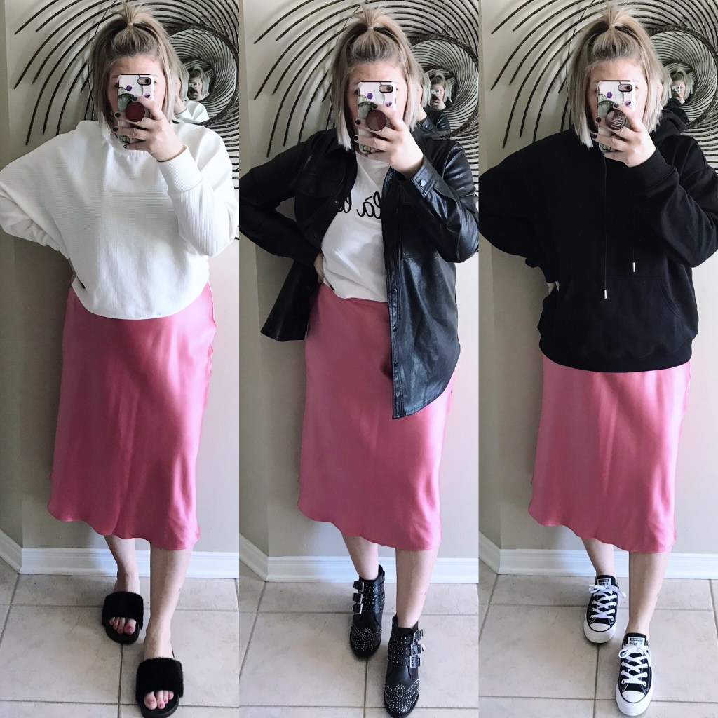 So, for my V-Day looks this year, instead of buying a new dress that I won’t be wearing for obvious reasons, I have decided to create different looks with pieces I already have in my closet. The main focus will be these two items: a pink blazer & a pink satin skirt.