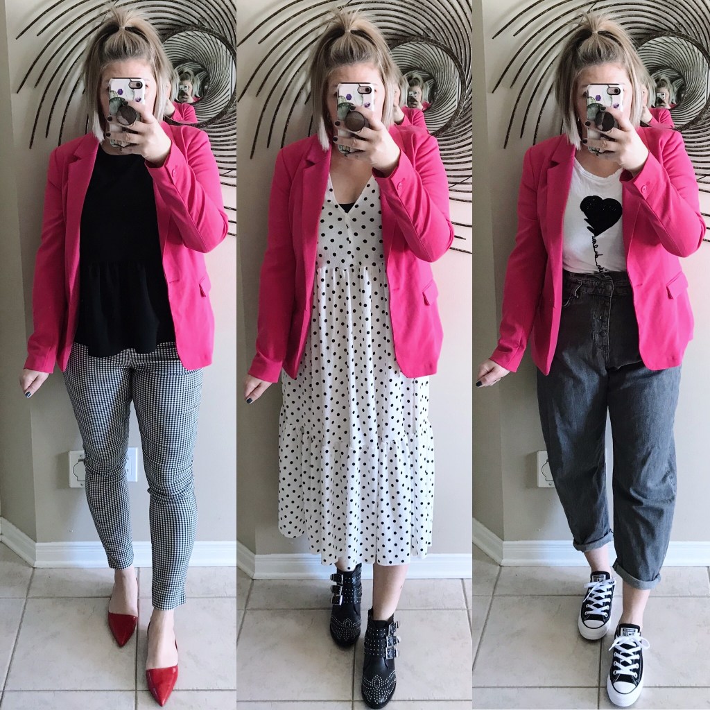 My second look is all about styling my pink blazer by pairing it with a fun polka dot midi dress and edgy ankle boots. Something about this look that screams comfortable yet trendy at the same time and I’m all here for it!