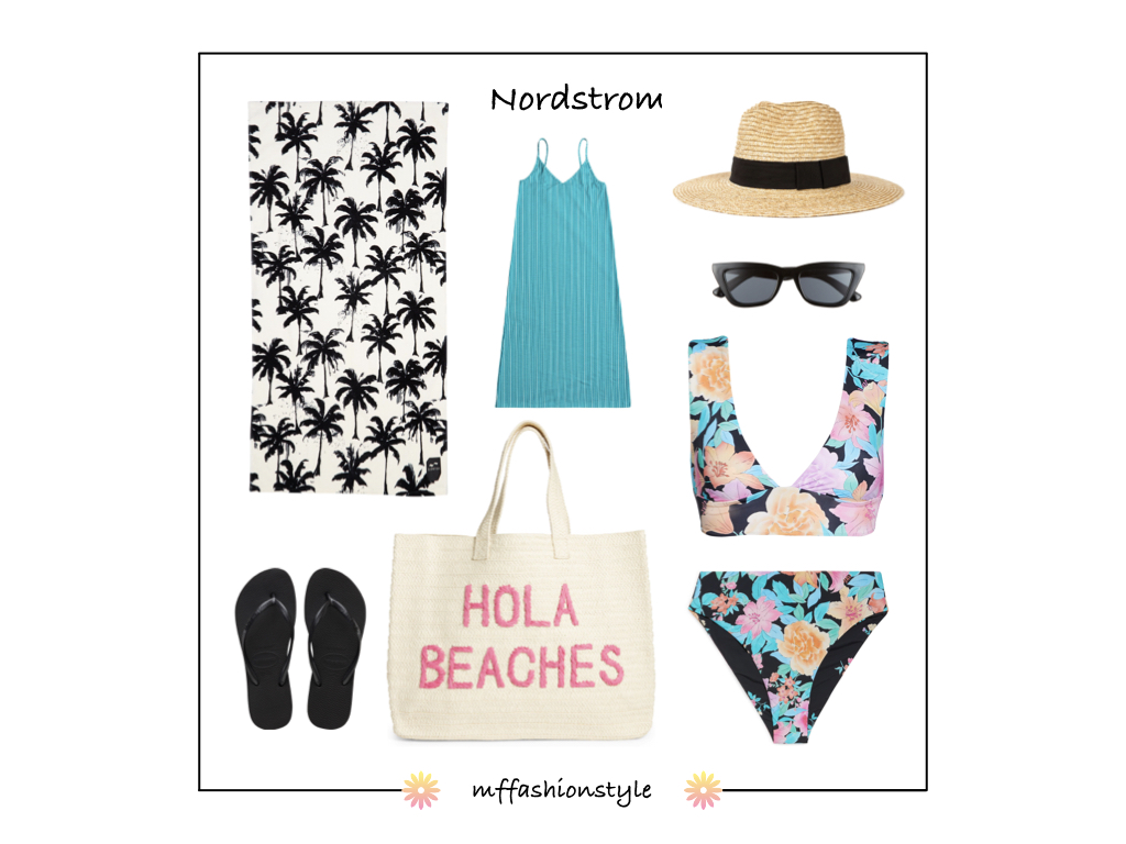 TOWEL | KNIT SUNDRESS | FLIP FLOPS | STRAW TOTE | STRAW HAT | SUNGLASSES | BIKINI TOP | BIKINI BOTTOM