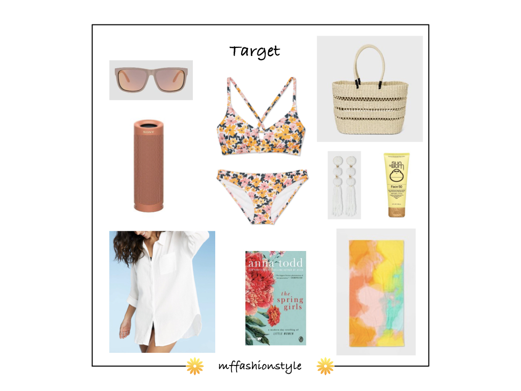 SUNGLASSES | BLUETOOTH WATERPROOF SPEAKER | COVER-UP SHIRTDRESS | BIKINI TOP | BIKINI BOTTOM | BOOK | STRAW TOTE HANDBAG | TASSEL EARRINGS |