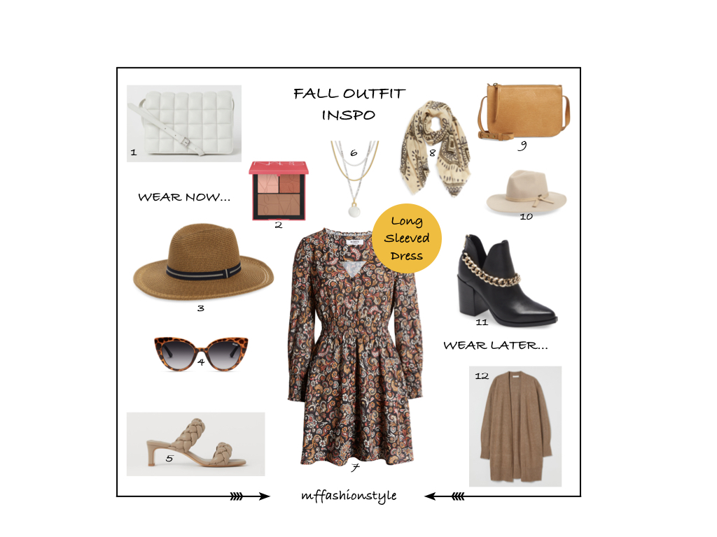 7. LONG SLEEVE DRESS \ 8. PRINT WRAP SCARF \ 9. LEATHER CROSSBODY BAG \
